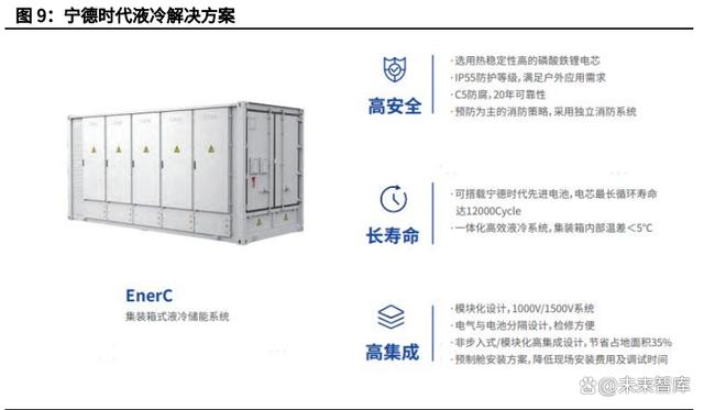 各大主流集成廠商近年來均推出了液冷產(chǎn)品,在能量密度、電池壽命上較風(fēng) 冷產(chǎn)品有了顯著提升。陽光電源的 PowerTitan 產(chǎn)品采用液冷溫控的方式,實 現(xiàn)了所有電芯溫差小于 2.5℃,使電池壽命延長 2 年以上。海博思創(chuàng)的HyperA2-C3354、HyperA2-C6709 產(chǎn)品采用了同程均衡液冷管路設(shè)計,實現(xiàn)了 溫差不超過 3℃,電池壽命延長 20%。比亞迪的 Cube T28 產(chǎn)品采用了液冷技術(shù), 空間利用率遠遠高于傳統(tǒng)預(yù)留風(fēng)道的風(fēng)冷系統(tǒng)。寧德時代的 EnerC 產(chǎn)品,能量 密度較傳統(tǒng)風(fēng)冷系統(tǒng)提高了近兩倍,可將單簇 416 個電芯溫差控制在 3°C 以內(nèi), 全系統(tǒng) 4160 個電芯溫差控制在 5°C 以內(nèi)。
