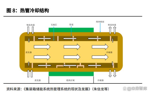 相變材料和熱管冷卻仍處于在研階段,成本和穩(wěn)定性是影響其投產(chǎn)的重要原 因。相變材料冷卻是使電池單體直接接觸相變材料,利用其相變過程吸收熱 量實現(xiàn)對鋰離子電池的冷卻。相變材料冷卻可以明顯提升儲能系統(tǒng)溫度分布 的均勻性,但其價格較高,且當(dāng)相變材料吸熱時,其體積變化明顯,容易對 儲能系統(tǒng)的工作性能產(chǎn)生影響。熱管是一種利用介質(zhì)在吸熱端的蒸發(fā)帶走熱 量,再在放熱端通過冷凝的方式將熱量傳遞到外界的裝置,這一冷卻技術(shù)已 相對成熟,但其成本較高,在手機等電子設(shè)備上使用較多,應(yīng)用于儲能系統(tǒng) 上性價比低。