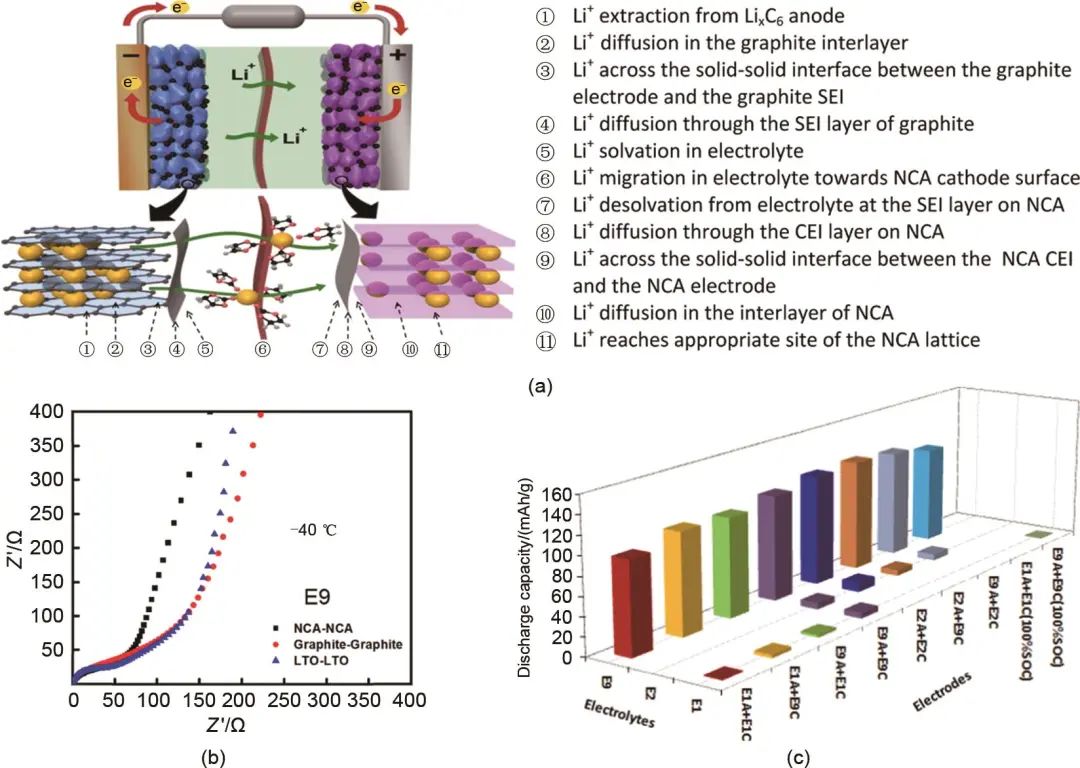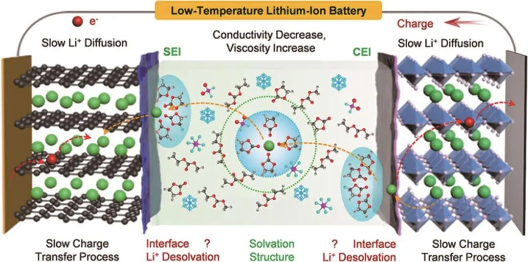 鋰電池低溫性能衰退的原因機(jī)理如圖2所示,主要是:①低溫下電解液的電導(dǎo)率下降,黏度上升,阻礙了Li+在電解液內(nèi)的遷移;②Li+在負(fù)極(例如石墨、硅、鋰金屬)或正極(例如LiNixMnyCo1-x-yO2)中的擴(kuò)散系數(shù)在低溫下下降,導(dǎo)致從電極擴(kuò)散到電解液內(nèi)的Li+減少;③低溫下電荷轉(zhuǎn)移過(guò)程更加困難,電荷轉(zhuǎn)移電阻(Rct)顯著提高,并且Li+在SEI和CEI內(nèi)的擴(kuò)散系數(shù)下降。這三個(gè)原因分別從主體電解液中遷移、電極內(nèi)部擴(kuò)散以及界面電荷轉(zhuǎn)移三個(gè)方面阻礙了鋰電池的正常運(yùn)行,造成了電池極化效應(yīng)的增大,從而降低了電池的放電容量和循環(huán)性能。