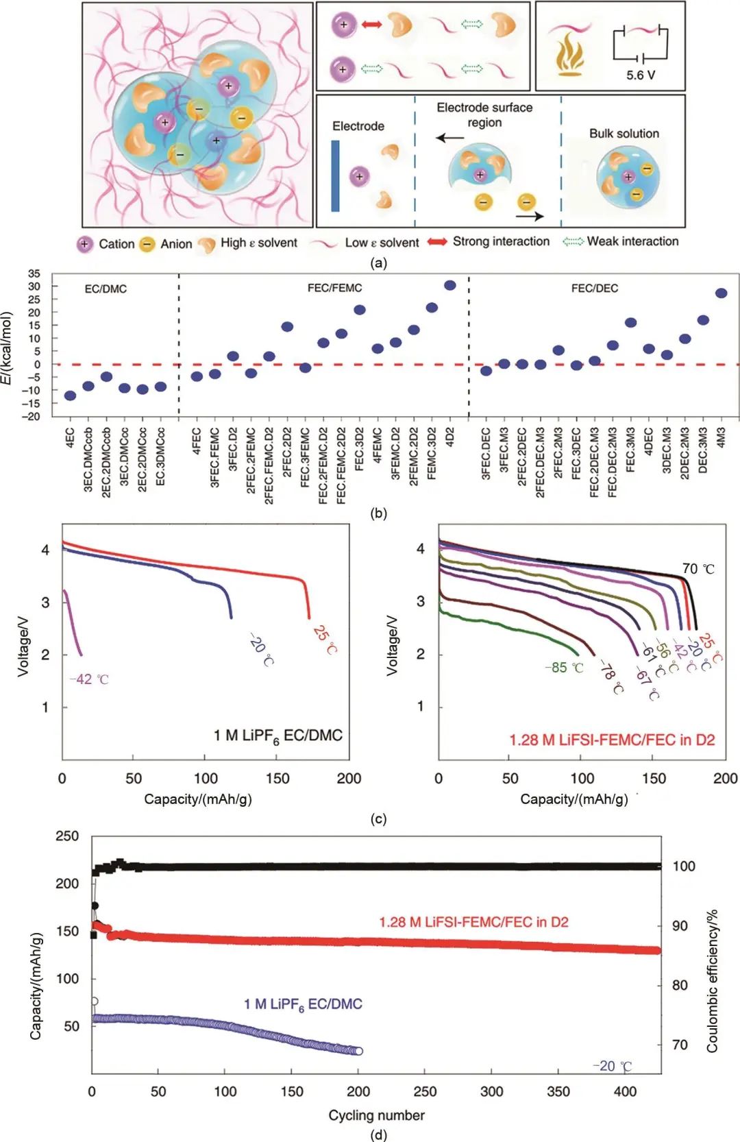 不同溫度下局部高濃電解液和常規(guī)電解液的 (c) 放電性能和 (d) 低溫循環(huán)性能對(duì)比