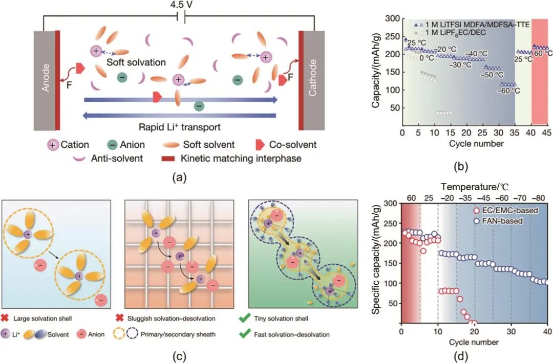 (c) 小尺寸溶劑衍生的快速離子傳輸機(jī)理圖;(d) 不同溫度下使用FAN基電解液的石墨/NMC電池的循環(huán)性能