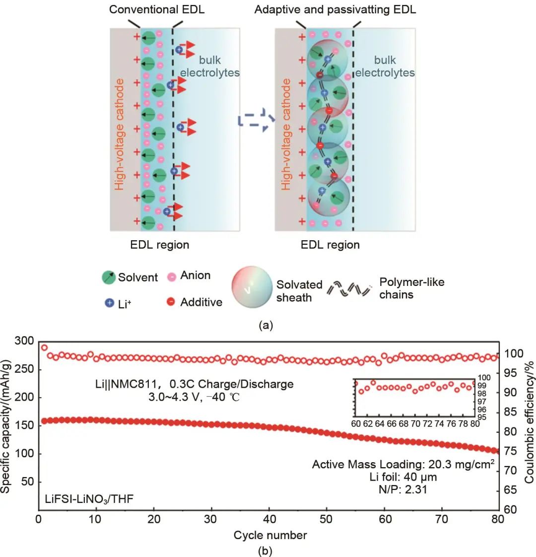 電池中的電極反應(yīng)都是在電極-電解質(zhì)界面發(fā)生的,調(diào)控鋰離子在電極-電解質(zhì)界面處的溶劑化結(jié)構(gòu)和電荷轉(zhuǎn)移行為,加快鋰離子在界面處的離子傳輸和去溶劑化過(guò)程,有助于電池實(shí)現(xiàn)在低溫下高效穩(wěn)定運(yùn)行。Zhang等提出了一種加入“刺激響應(yīng)型”添加劑的在正極/電解液界面構(gòu)建了動(dòng)態(tài)高穩(wěn)定雙電層的界面溶劑化結(jié)構(gòu)調(diào)控策略。作者篩選了一系列離子尺寸小且與鋰離子具有強(qiáng)結(jié)合能力的陰離子作為“刺激響應(yīng)型”添加劑(例如NO3-、ClO4-、Br-等),如圖11(a)所示,添加劑陰離子在電池充電時(shí),可在電壓驅(qū)動(dòng)下快速遷移到正極界面,添加劑陰離子與鋰離子間的強(qiáng)相互作用使得在正極界面雙電層中形成了特殊的“超分子動(dòng)態(tài)網(wǎng)絡(luò)結(jié)構(gòu)”。在此動(dòng)態(tài)網(wǎng)絡(luò)結(jié)構(gòu)中,添加劑吸引豐富的鋰離子,促進(jìn)鋰離子在界面處的遷移和從主體電解液中脫去溶劑,并且雙電層處于“富鋰離子-貧電解液”狀態(tài),其內(nèi)部所有的溶劑分子都參與鋰離子溶劑化,降低了雙電層內(nèi)溶劑的HOMO能級(jí),將不穩(wěn)定的“自由溶劑”排除出雙電層,顯著提升了正極界面上溶劑的氧化穩(wěn)定性。通過(guò)這樣巧妙的電極/電解液界面設(shè)計(jì)實(shí)現(xiàn)了本體醚基電解液和界面電解液的解耦,憑借本體電解液的高離子導(dǎo)電性和界面處快速的電荷轉(zhuǎn)移機(jī)制實(shí)現(xiàn)了優(yōu)異的低溫性能。相較于常規(guī)電解液在0 ℃以下迅速下降的低溫性能,添加劑輔助的醚類電解液實(shí)現(xiàn)了Li/NMC全電池在-40 ℃下的穩(wěn)定充放電循環(huán)[圖11(b)]。這種利用特殊界面化學(xué)來(lái)優(yōu)化電解液低溫性能的方式在后期被廣泛關(guān)注,研究人員進(jìn)一步豐富了具有界面調(diào)控功能的添加劑類型并對(duì)吸附性添加劑在界面的作用機(jī)理進(jìn)行了補(bǔ)充探究。