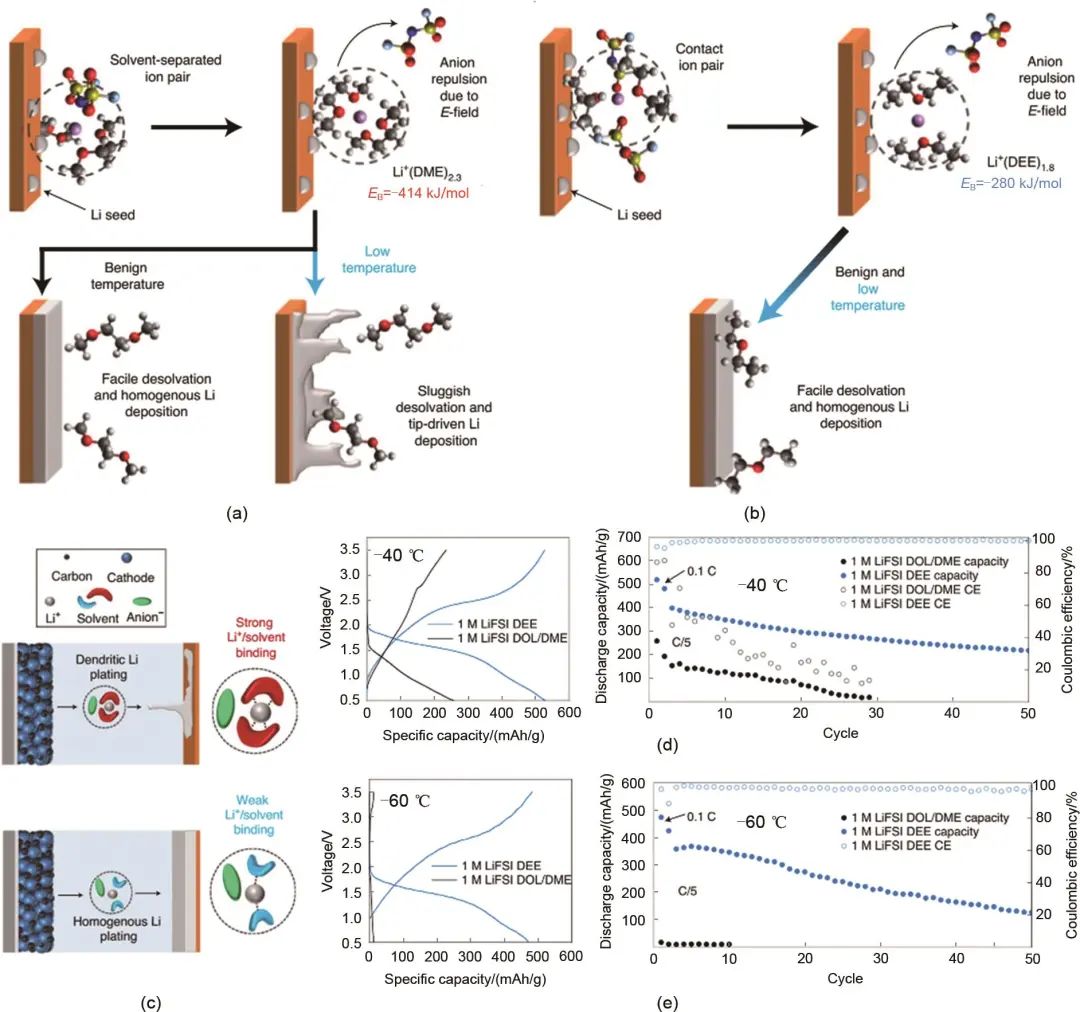 傳統(tǒng)低溫電解液研究大多是針對(duì)LIBs,但是因?yàn)槭?fù)極對(duì)EC的依賴性和其低溫工作范圍很難降低到-40 ℃以下,所以其實(shí)際應(yīng)用受到了限制。同時(shí)值得注意的是傳統(tǒng)低溫電解液研究大多是針對(duì)低溫放電容量性能的提升,對(duì)于其低溫充電和低溫循環(huán)性能的研究很少,少數(shù)涉及循環(huán)性能的研究也都是采用室溫充電、低溫放電的循環(huán)模式。這主要是因?yàn)長(zhǎng)IBs在低溫充電過(guò)程中石墨負(fù)極會(huì)發(fā)生鋰沉積,嚴(yán)重限制鋰離子在負(fù)極中的擴(kuò)散和電池整體的安全性,從而導(dǎo)致其低溫充電性能遠(yuǎn)遠(yuǎn)不如低溫放電性能。石墨負(fù)極在低溫下的種種限制,使其成為了LIBs低溫性能難以進(jìn)一步提升的根本原因。近幾年在不斷追求更高能量密度的儲(chǔ)能裝置的社會(huì)背景下,以鋰金屬電池為代表的下一代鋰電池獲得了廣泛的關(guān)注。LMBs相較于LIBs有明顯更高的能量密度,且由于不再使用石墨負(fù)極,其電解液不再嚴(yán)格需要一定含量的EC,轉(zhuǎn)而可以使用醚類等具有更好低溫性能的電解液組分,使得在探尋LMBs低溫電解液時(shí)有更多的可能性。但是由于低溫下受阻的離子傳輸和過(guò)大的極化效應(yīng),使得鋰金屬負(fù)極更容易發(fā)生不均勻的鋰金屬沉積導(dǎo)致嚴(yán)重的鋰枝晶生長(zhǎng),在研究LMBs低溫電解液時(shí)電池的安全性需要更加重視。同時(shí),隨著能源市場(chǎng)的技術(shù)要求不斷升級(jí),低溫電池的性能探索也不再局限于提升單次低溫放電的容量保持率,研究人員希望通過(guò)對(duì)電池電解液的設(shè)計(jì)來(lái)實(shí)現(xiàn)低溫環(huán)境下的高效穩(wěn)定循環(huán)??偟膩?lái)看,新型低溫鋰電池電解液設(shè)計(jì)更加聚焦于鋰金屬電池電解液,希望對(duì)充放電過(guò)程中鋰離子遷移機(jī)理進(jìn)行優(yōu)化,從根本上理解鋰電池的低溫性能提升方法,實(shí)現(xiàn)鋰電池的長(zhǎng)壽命高效低溫充放電循環(huán)。
