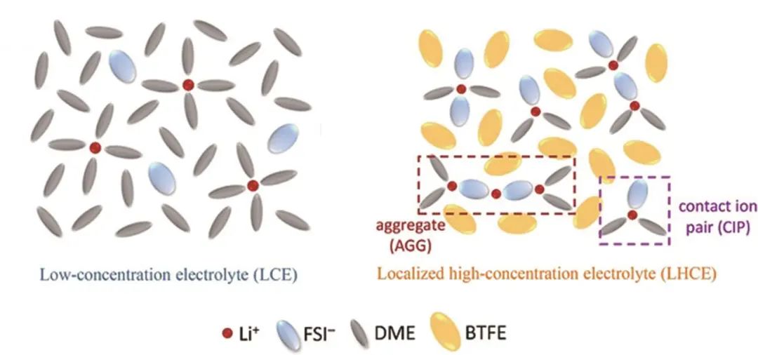 近些年來(lái),高濃度電解液(HCEs)受到了廣泛的關(guān)注,通過(guò)提高電解液中的鋰鹽濃度,使得大量的鋰離子將全部溶劑完全配位,顯著提高溶劑的HOMO能級(jí),提高電解液的電化學(xué)穩(wěn)定性。更重要的是當(dāng)溶劑分子和鋰離子的摩爾比大于4時(shí),溶劑分子不足以和大量的鋰離子完全配位,因此陰離子會(huì)“擠”進(jìn)溶劑化鞘中,形成接觸離子對(duì)的CIP結(jié)構(gòu)和聚集離子對(duì)的AGG結(jié)構(gòu),這一存在陰離子的溶劑化結(jié)構(gòu)相較于原有的SSIP結(jié)構(gòu)擁有更低的去溶劑化能壘,并且參與溶劑化的陰離子表現(xiàn)出更低的LUMO能級(jí),在形成SEI/CEI過(guò)程中,溶劑化結(jié)構(gòu)中的陰離子會(huì)優(yōu)先還原分解,形成含有更多陰離子衍生的無(wú)機(jī)組分的SEI,其擁有更好的電化學(xué)性能和機(jī)械穩(wěn)定性、更有利的鋰金屬兼容性,顯著提高鋰金屬負(fù)極的循環(huán)穩(wěn)定性。但是HCEs的黏度高、潤(rùn)濕性差、電導(dǎo)率低等問(wèn)題使得其在低溫下幾乎不能使用,并且由于超高的鋰鹽黏度,電池的能量密度顯著下降,成本也不可接受,這些都限制了HCEs的實(shí)際運(yùn)用。為了解決HCEs的種種問(wèn)題,研究人員提出使用非極性的低黏度稀釋劑來(lái)稀釋HCEs,非極性稀釋劑與鋰離子沒有相互作用,有效保留HCEs中特殊的CIP和AGG溶劑化結(jié)構(gòu)的同時(shí),可降低鋰鹽濃度和電解質(zhì)的黏度,提高了整體電解液的電導(dǎo)率。如圖8所示,這種采用稀釋高濃電解液的方式得到的電解液被稱為局部高濃電解液(LHCEs),其保留了HCEs優(yōu)點(diǎn)的同時(shí),極大地改進(jìn)了HCEs的缺點(diǎn),并且降低了成本,提高了整體的能量密度。