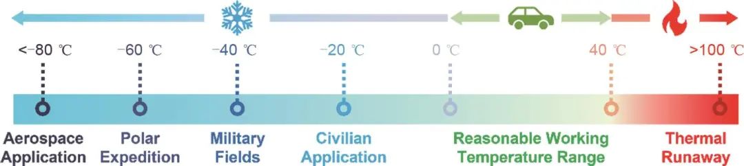 除了對(duì)能量密度的要求外,對(duì)鋰電池在特殊環(huán)境下的使用性能要求也越來(lái)越高。近年來(lái),鋰電池在低溫環(huán)境下的性能受到了廣泛的關(guān)注。圖1展示了應(yīng)用于不同領(lǐng)域的鋰電池所需的有效工作溫度范圍,在寒冷的季節(jié)或嚴(yán)寒地區(qū),消費(fèi)電子或電動(dòng)汽車上的民用鋰電池需要適應(yīng)接近-20 ℃的低溫并要求進(jìn)行穩(wěn)定的電池充放電,而使用在軍事或航空航天領(lǐng)域的電化學(xué)儲(chǔ)能系統(tǒng)的使用環(huán)境溫度甚至低于-60 ℃,但是目前普遍商業(yè)化使用的碳酸酯基電解液在-20 ℃時(shí)會(huì)發(fā)生電導(dǎo)率下降、黏度上升,甚至凝固等現(xiàn)象,引發(fā)電池嚴(yán)重的容量衰退、壽命減短和充電困難,這限制了現(xiàn)有鋰離子電池在低溫條件下的使用。因此如何抑制鋰電池在低溫下的容量衰退,提高其在低溫下的使用壽命和循環(huán)穩(wěn)定性,是鋰電池未來(lái)發(fā)展中的一個(gè)最重要的挑戰(zhàn)。