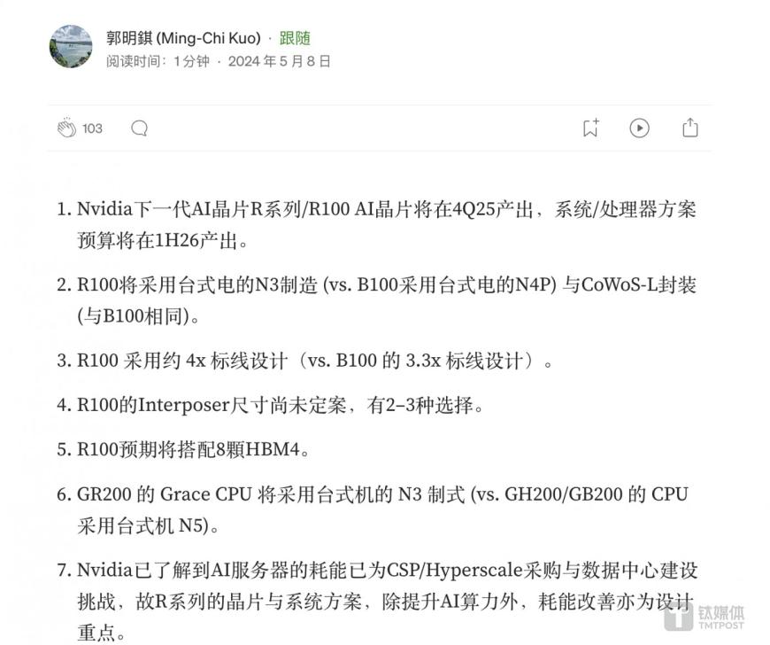 天風(fēng)國際證券分析師郭明錤指出,英偉達(dá)下一代R系列/R100 AI芯片將于2025年第四季度量產(chǎn),采用臺(tái)積電3nm制程、4個(gè)reticle設(shè)計(jì),搭配8顆HBM4,重點(diǎn)改善能耗。最早在明年,R100 AI GPU就將登場。