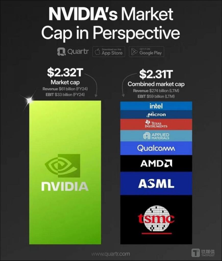 鈦媒體App 5月24日消息,截至今早美股收盤,“AI之王”英偉達(dá)(NASDAQ:NVDA)市值一天內(nèi)暴漲2180億美元(約合人民幣1.56萬億元),達(dá)到2.56萬億美元市值——超過臺(tái)積電、阿斯麥、AMD、高通、應(yīng)用材料、德州儀器、美光科技、英特爾等半導(dǎo)體巨頭的市值總和。同時(shí),股價(jià)也首次沖破1000美元/股,創(chuàng)下歷史新高。