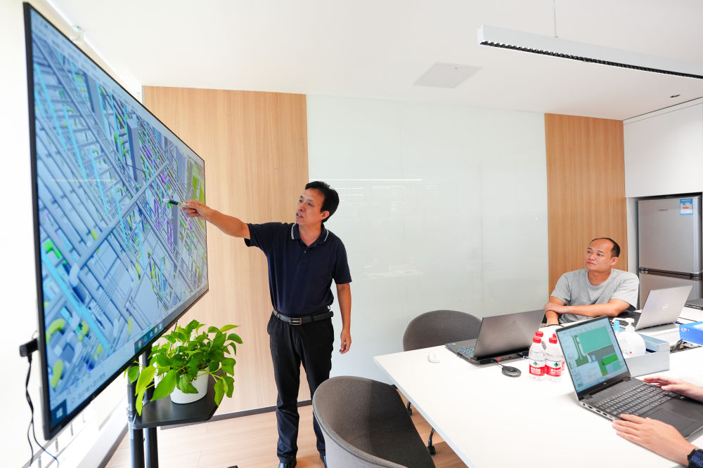 2024年8月26日,中國電子院工作人員在討論某先進(jìn)半導(dǎo)體項目物流仿真方案