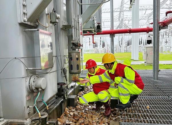 圖說(shuō):國(guó)網(wǎng)上海超高壓公司1000千伏練塘站運(yùn)維人員檢查特高壓主變運(yùn)行情況