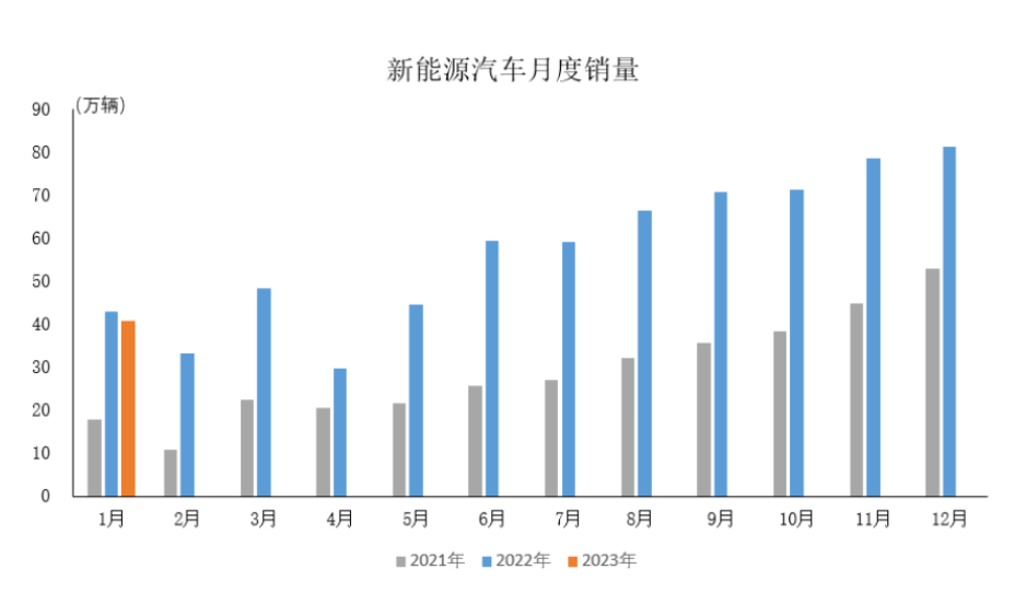2023年1月,新能源汽車產(chǎn)銷分別完成42.5萬輛和40.8萬輛,環(huán)比分別下降46.6%和49.9%,同比分別下降6.9%和6.3%,市場(chǎng)占有率達(dá)到24.7%。與2022年春節(jié)月(2月份)相比,產(chǎn)銷分別增長(zhǎng)15.4%和22.2%。
