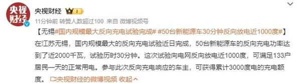 1月5日,據(jù)央視報(bào)道,近日在江蘇無錫,國內(nèi)規(guī)模最大的反向充電試驗(yàn)完成,50臺(tái)新能源車的反向充電功率達(dá)到了近2000千瓦,試驗(yàn)歷時(shí)30分鐘。這次試驗(yàn)向電網(wǎng)反向放電近1000度,可滿足133戶居民一天的正常用電。參與此次反向充電響應(yīng)的車主,可獲得累計(jì)3000度電的充電額度。