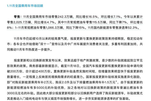 崔東樹分析,11月份汽車市場呈現(xiàn)產(chǎn)銷兩旺的態(tài)勢,生產(chǎn)和零售數(shù)據(jù)都呈現(xiàn)出歷史較高水準(zhǔn)。從價(jià)格指標(biāo)來看,整體市場價(jià)格走勢平穩(wěn),汽車消費(fèi)需求強(qiáng)勁、態(tài)勢良好,新能源車的銷售表現(xiàn)亮眼。