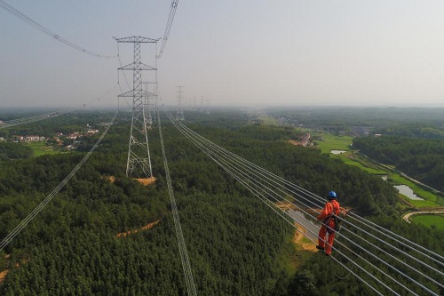 國網(wǎng)陜西電力員工在南陽—荊門—長沙1000千伏特高壓工程線路安裝間隔棒。