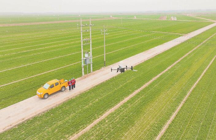 “紅馬甲”網格員操作無人機巡檢農業(yè)排灌重點線路。