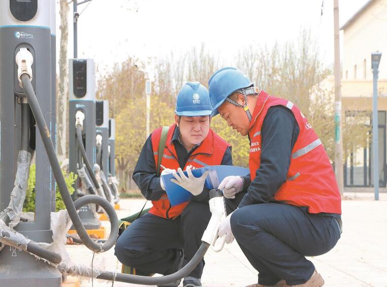 “紅馬甲”網格員檢查充電樁設備,服務綠色出行。