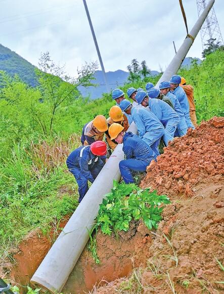 7月13日,在百色市德??h城關(guān)鎮(zhèn)云梯村足斗屯電網(wǎng)改造現(xiàn)場,施工人員合力把電桿移進(jìn)桿坑里。 冉袖言 攝