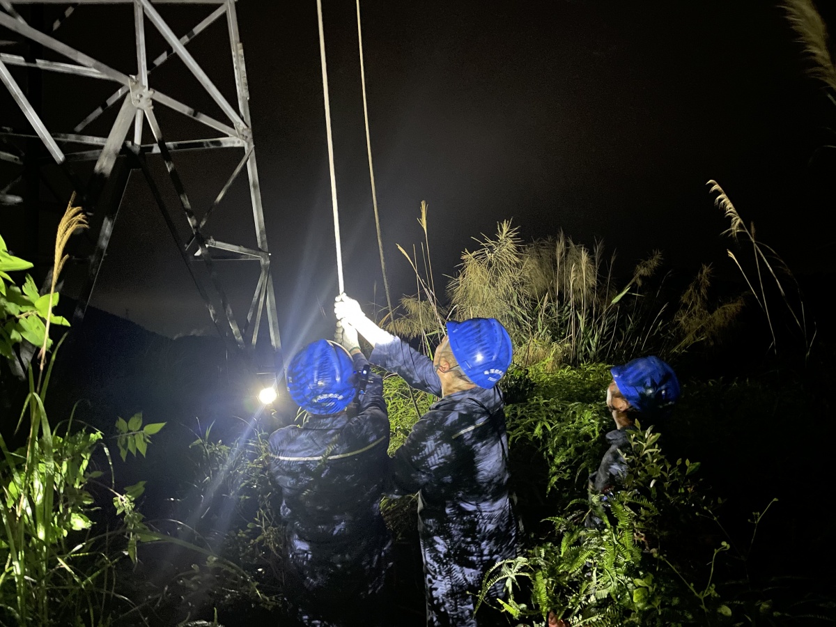 4月20日晚,南方電網(wǎng)廣西新電力集團(tuán)岑溪供電公司搶修人員在山間開(kāi)展35千伏大歸線20號(hào)塔C相絕緣子遭雷擊脫落接地故障搶修工作。通訊員 韋銳 攝