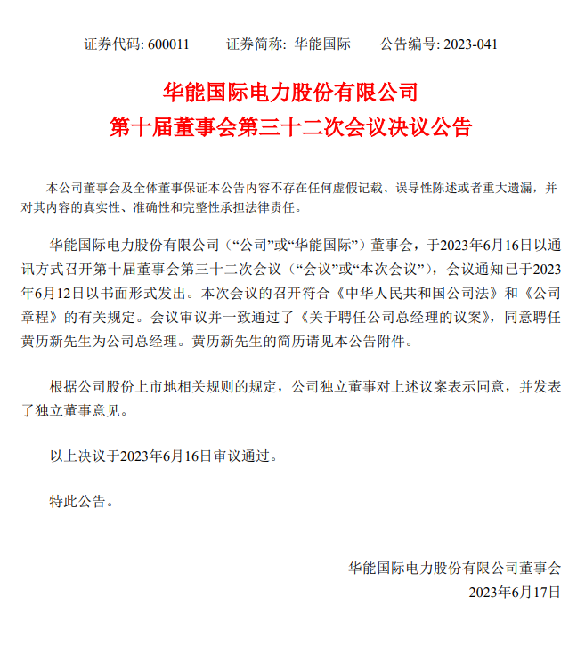 2022年9月26日,華能國際原總經(jīng)理趙平先生因年齡原因辭職。華能國際公告稱,在華能國際聘任新任總經(jīng)理前,由華能國際董事長趙克宇先生代行總經(jīng)理職責。時隔9個月,華能國際總經(jīng)理一職終于迎來新人選!2023年6月16日,華能國際召開董事會,審議并一致通過了《關于聘任公司總經(jīng)理的議案》,同意聘任黃歷新先生為公司總經(jīng)理。