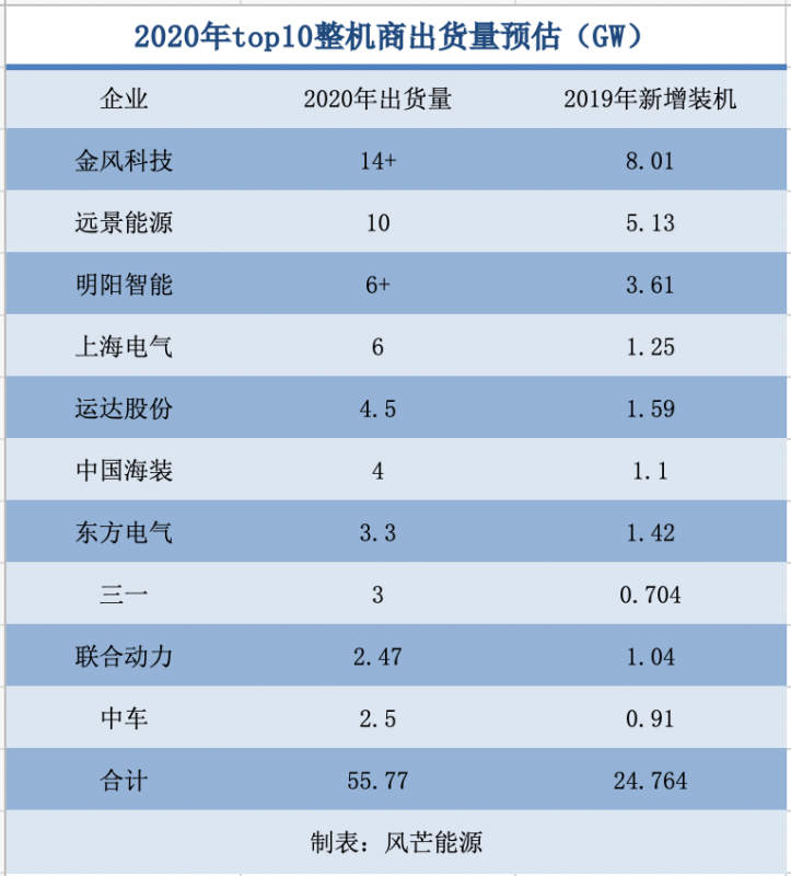 根據(jù)風(fēng)芒能源問詢、統(tǒng)計(jì)以及預(yù)估,2020年全年,排名前十的整機(jī)商出貨量將超過50GW左右。相較于光伏行業(yè)動(dòng)態(tài)變化的集中趨勢(shì),風(fēng)電整機(jī)商的排名及市占率基本保持穩(wěn)定。其中,TOP3的整機(jī)商金風(fēng)科技、遠(yuǎn)景能源、明陽(yáng)智能累計(jì)出貨量超過30GW,三家市場(chǎng)占比最終預(yù)計(jì)在60%左右,與2019年的62.6%比,雖受搶裝影響,三家市占率稍有減弱,但行業(yè)集中度基本未受影響。