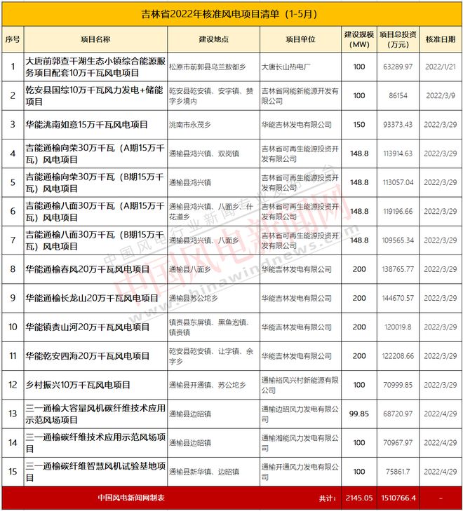 1-5月,吉林省發(fā)改委連續(xù)核準(zhǔn)批復(fù)大唐前郭查干湖生態(tài)小鎮(zhèn)綜合能源服務(wù)項(xiàng)目配套10萬(wàn)千瓦風(fēng)電項(xiàng)目、、乾安縣國(guó)綜10萬(wàn)千瓦風(fēng)力發(fā)電+儲(chǔ)能項(xiàng)目、華能洮南如意15萬(wàn)千瓦風(fēng)電項(xiàng)目等15個(gè)風(fēng)電項(xiàng)目,規(guī)模共計(jì)2145.05MW,總投資超151億元。其中三一獲核準(zhǔn)299.85MW,華能獲核準(zhǔn)1545.2MW。