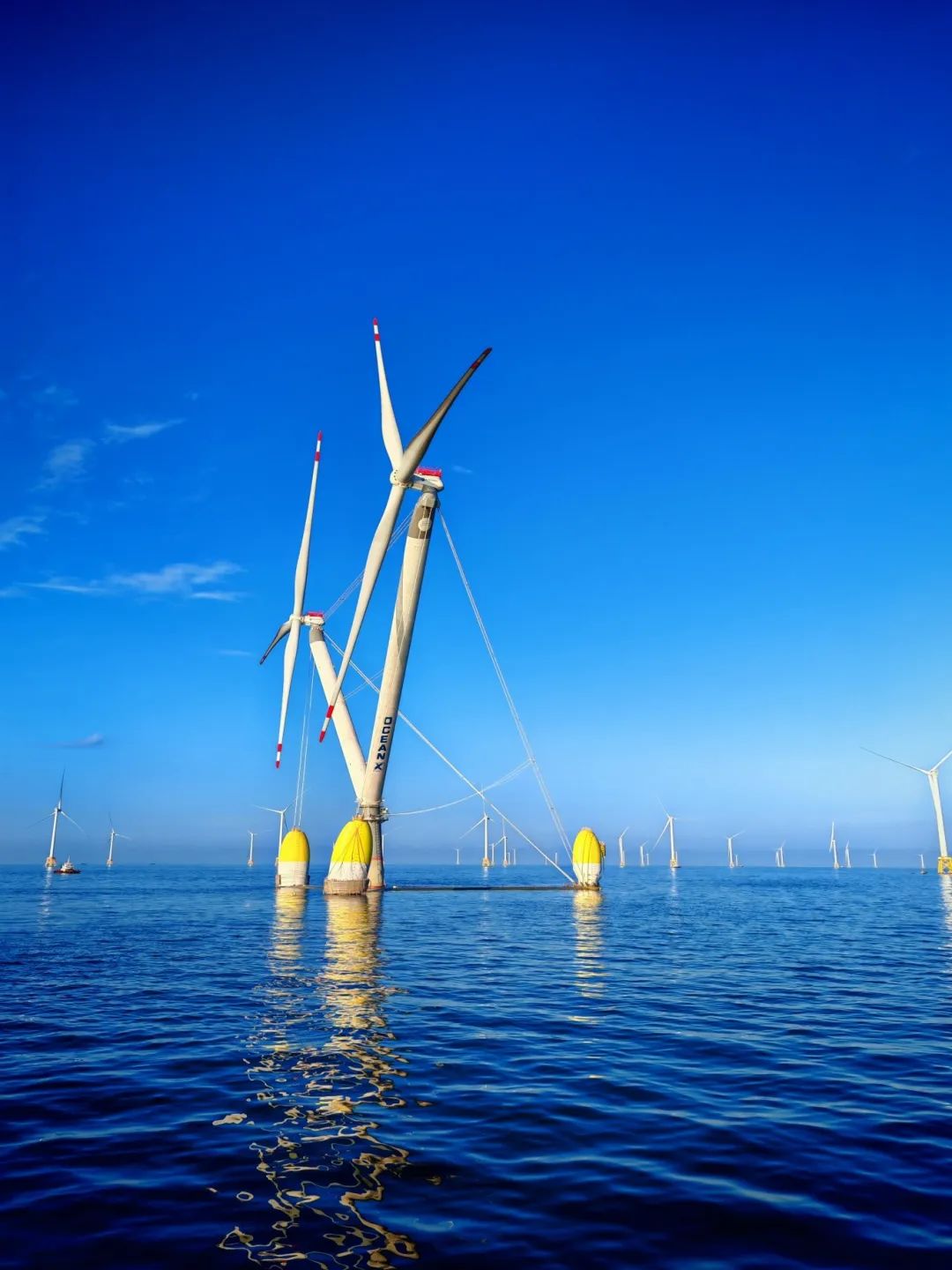 中國(guó)電建所屬貴州工程公司負(fù)責(zé)該試驗(yàn)型機(jī)組的基礎(chǔ)半潛式平臺(tái)拖航、靠泊帶纜、浮筒水泥固定壓載水上澆筑、風(fēng)機(jī)吊裝、碼頭試驗(yàn)以及漂浮式風(fēng)力發(fā)電機(jī)組的整機(jī)拖航、錨泊系統(tǒng)安裝、海上就位安裝以及相關(guān)調(diào)試、試驗(yàn)等工作。