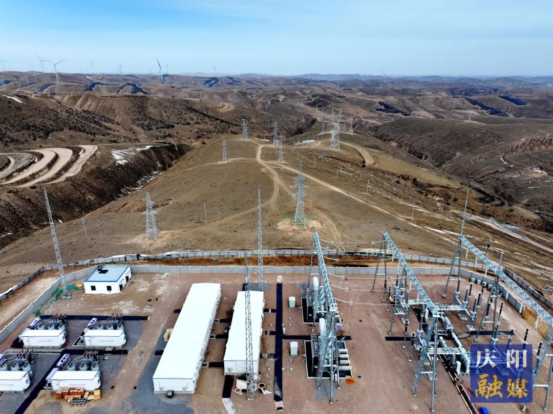 慶陽市環(huán)縣小南溝鄉(xiāng)拍攝的華能慶陽600萬千瓦風光綜合新能源示范項目C1升壓站工程(2月14日攝)。
