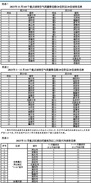 11月和1—11月重點(diǎn)區(qū)域出現(xiàn)重度及以上污染天的城市及具體天數(shù)詳見(jiàn)附表3。