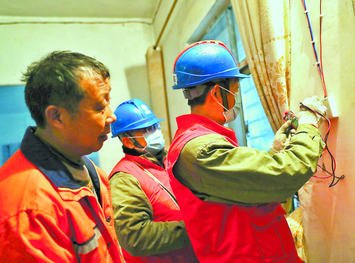 胡金剛(右一)為返鄉(xiāng)村民楊國(guó)紅檢修家中線路。