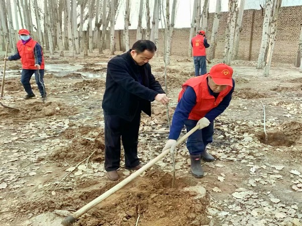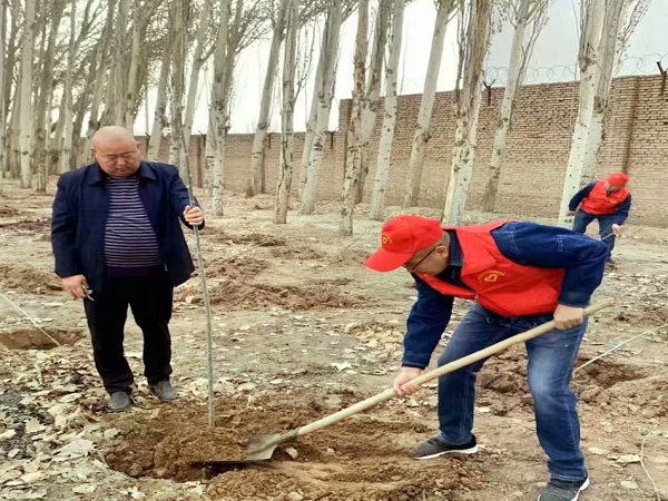 上午十點,春風(fēng)送爽,天氣宜人。20余名員工按照分工要求,同志們迫不及待地拿起鐵鍬開始鏟土,認真細致地挖著樹苗和土坑,一陣緊張的忙碌過后,大家將樹苗立在土坑上面,扶好樹苗,精心的完成著從挖坑、放樹、填土、踩實到最后澆水的每一個步驟,有條不紊,很快一棵樹苗站立起來。