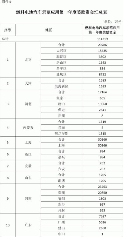 根據(jù)公示文件,第一年度共有10個(gè)省級(jí)行政區(qū)獲得燃料電池車示范應(yīng)用獎(jiǎng)勵(lì)資金,其中北京29786萬元、天津1583萬元、河北17164萬元、內(nèi)蒙古1519萬元、上海30366萬元、浙江884萬元、安徽262萬元、山東1205萬元、河南23763萬元、廣東7687萬元,總計(jì)114219萬元。