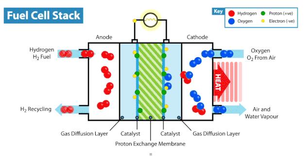氫燃料電池工作原理是氫氣通過燃料電池正極當中的催化劑(鉑)分解成電子和氫離子(質(zhì)子)。其中質(zhì)子通過質(zhì)子交換膜(Proton Exchange Membrane)到達負極和氧氣反應(yīng)變成水和熱量。對應(yīng)的電子則從正極通過外電路流向負極產(chǎn)生電能。