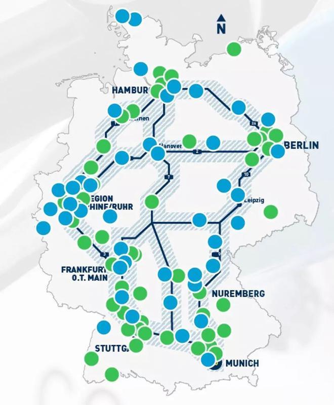 H2M在德國已經(jīng)運營(綠色)及在建加氫站(藍色)示意圖