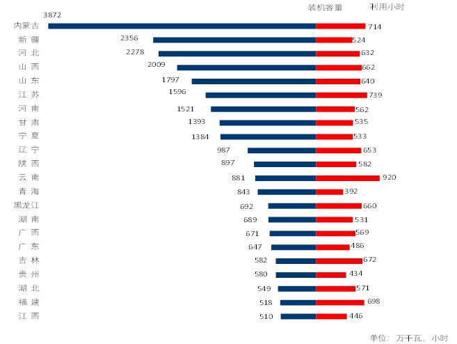 圖3 1-3月份風電裝機較多省份風電裝機容量和設備利用小時
