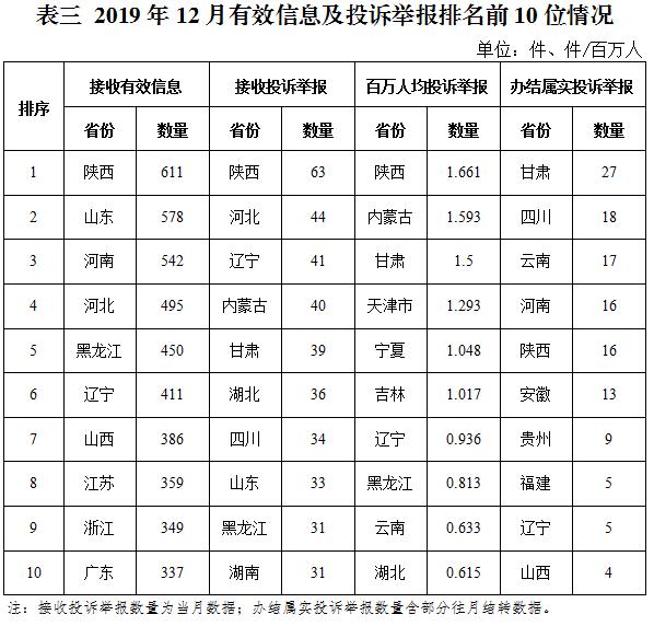各?。ㄗ灾螀^(qū)、直轄市)按照收到的有效信息數(shù)量排序,陜西、山東、河南、河北、黑龍江等列全國(guó)前10位;按照投訴舉報(bào)數(shù)量排序,陜西、河北、遼寧、內(nèi)蒙古、甘肅等排在全國(guó)前10位;按照百萬人均投訴舉報(bào)數(shù)量排序,陜西,內(nèi)蒙古,甘肅,天津市,寧夏等排在全國(guó)前10位;按照辦結(jié)屬實(shí)投訴舉報(bào)數(shù)量排序,甘肅、四川、云南、河南、陜西等排在全國(guó)前10位。(2019年12月有效信息及投訴舉報(bào)排名前10位情況見表三)