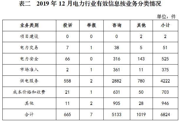 電力行業(yè)排在首位,有效信息數(shù)量為6824件,占全部有效信息的81.05%;其中受理的投訴舉報(bào)數(shù)量為672件,占全部投訴舉報(bào)數(shù)量的97.39%。群眾反映的問題主要集中在供電服務(wù)、電力安全、成本價(jià)格和收費(fèi)等方面。(2019年11月電力行業(yè)有效信息按業(yè)務(wù)分類情況見表二)