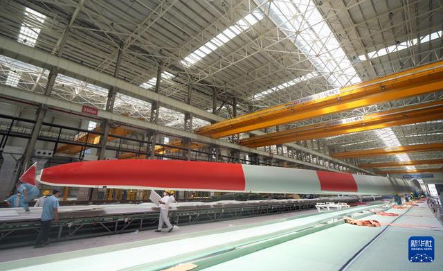 6月6日,在射陽中車風電葉片工程有限公司生產(chǎn)車間拍攝的大型風機葉片。新華社記者 李尕 攝