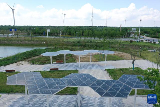6月6日在射陽港低(零)碳產(chǎn)業(yè)園拍攝的長廊頂部太陽能光伏系統(tǒng)(無人機照片)。新華社記者 楊磊 攝