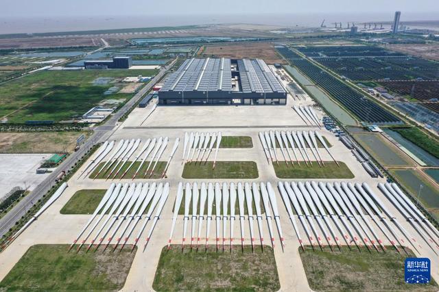 6月6日拍攝的位于射陽港低(零)碳產(chǎn)業(yè)園的射陽中車風電葉片工程有限公司的外景照片(無人機照片)。新華社記者 楊磊 攝