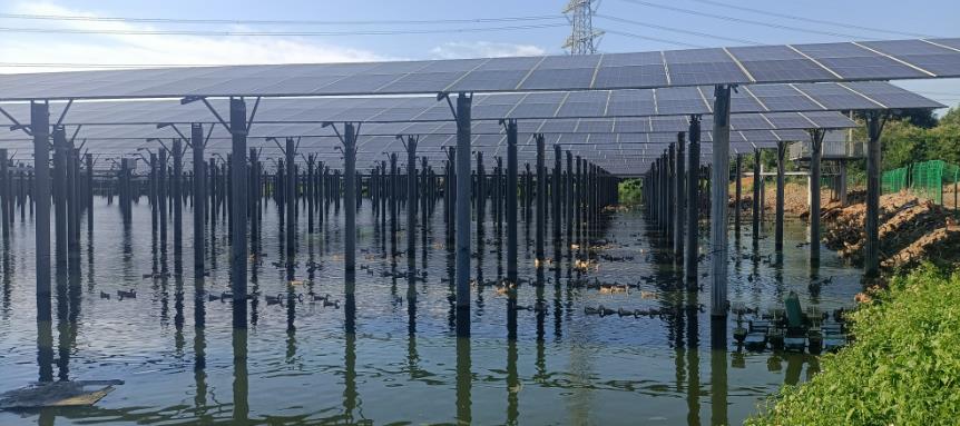 平坡光伏電站位于湛江市良垌鎮(zhèn),總裝機(jī)容量90兆瓦,項(xiàng)目采用漁光互補(bǔ)模式,在1650畝水養(yǎng)殖魚塘上架設(shè)光伏組件,利用水面上的光伏組件發(fā)電,水下則可進(jìn)行水產(chǎn)魚、鴨養(yǎng)殖。同時,經(jīng)充分考慮白鷺等趨光性鳥類的生活特性,項(xiàng)目采用透光率極高的單晶雙玻雙面太陽能電池,其透光率達(dá)95%以上,因此,光伏陣列的反射光極少,很好地保障了鳥類生活環(huán)境不受破壞,實(shí)現(xiàn)了生態(tài)保護(hù)和能源綠色發(fā)展雙贏。