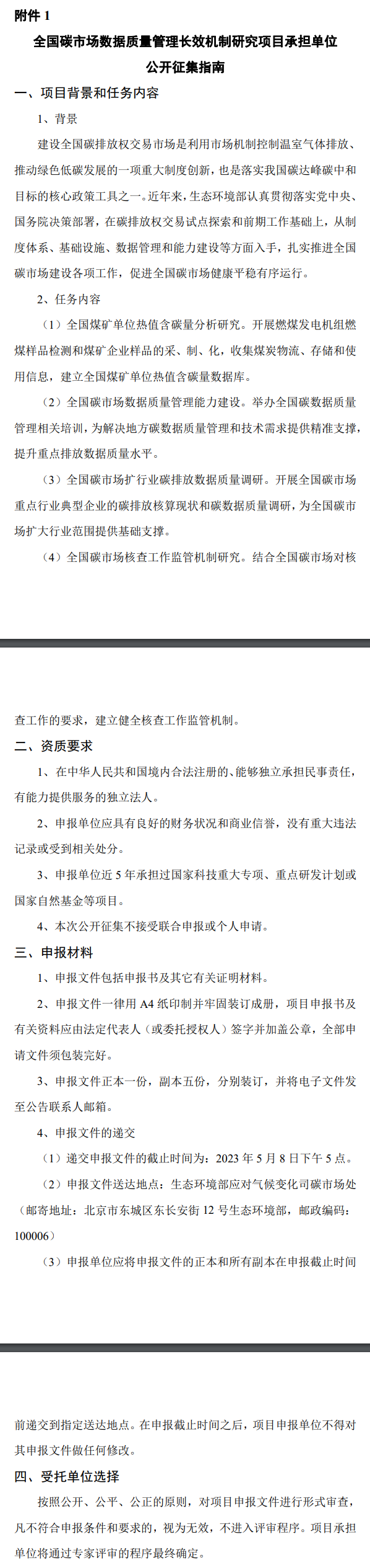 公開征集時間自2023年4月28日起,共5個工作日。申請文件請于5月8日前郵寄給生態(tài)環(huán)境部應對氣候變化司碳市場處(地址:北京市東城區(qū)東長安街12號生態(tài)環(huán)境部,郵編:100006),并將電子文件發(fā)至聯(lián)系人郵箱。