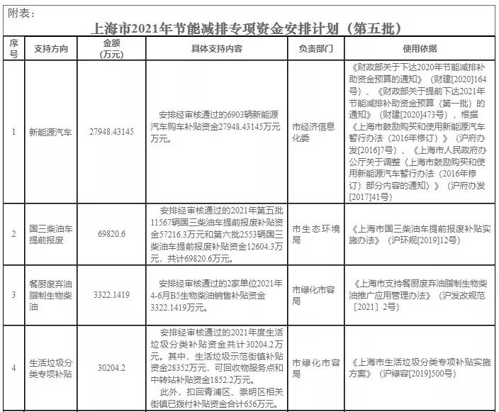 1、按照《財(cái)政部關(guān)于下達(dá)2020年節(jié)能減排補(bǔ)助資金預(yù)算的通知》(財(cái)建[2020]164號(hào))、《財(cái)政部關(guān)于提前下達(dá)2021年節(jié)能減排補(bǔ)助資金預(yù)算(第一批)的通知》(財(cái)建[2020]473號(hào)),根據(jù)《上海市鼓勵(lì)購買和使用新能源汽車暫行辦法(2016年修訂)》(滬府辦發(fā)[2016]7號(hào))、《上海市人民政府辦公廳關(guān)于調(diào)整〈上海市鼓勵(lì)購買和使用新能源汽車暫行辦法(2016年修訂)部分內(nèi)容的通知〉》(滬府辦發(fā)[2017]41號(hào))等規(guī)定,安排經(jīng)審核通過的6903輛新能源汽車購車補(bǔ)貼資金27948.43145萬元。