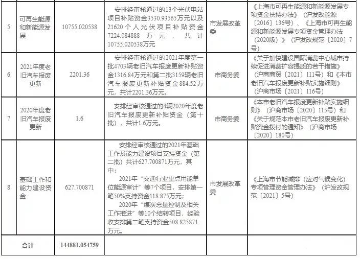 5、按照《上海市可再生能源和新能源發(fā)展專項(xiàng)資金扶持辦法》(滬發(fā)改能源〔2016〕136號(hào))、《上海市可再生能源和新能源發(fā)展專項(xiàng)資金管理辦法(2020版)》(滬發(fā)改規(guī)范〔2020〕7號(hào))等相關(guān)規(guī)定,安排經(jīng)審核通過的13個(gè)光伏電站項(xiàng)目以及21620個(gè)人光伏項(xiàng)目補(bǔ)貼資金,共計(jì)10755.020538萬元。