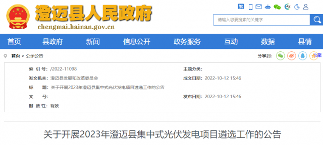10月12日,海南澄邁縣政府網(wǎng)發(fā)布“關(guān)于開(kāi)展2023年澄邁縣集中式光伏發(fā)電項(xiàng)目遴選工作的公告”。