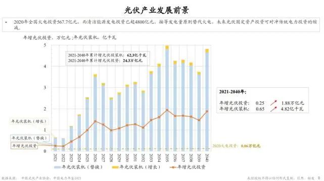 按照剛才的演進(jìn)路徑,光伏產(chǎn)業(yè)投資假如從2021年開始,新增的電源都是由光伏裝機(jī)來實(shí)現(xiàn),那么下面這張圖就展示了未來的20年的一個(gè)投資逐漸增加的過程,從開始大概0.25萬億,到后來大概2萬億的年投資,整個(gè)全過程完成約20年,總共的投資規(guī)模大概是20多萬億元。