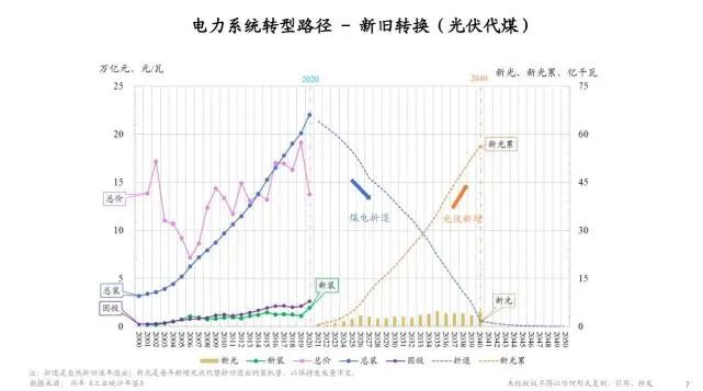 下面我們談一下,如果經(jīng)過進(jìn)一步論證,證明光伏能源作為一個(gè)可再生能源,有足夠大的規(guī)模可以替代煤炭做能源的基礎(chǔ),我們應(yīng)該怎么轉(zhuǎn)型?下面這張圖上左邊這一半實(shí)際上是2000年到2020年整個(gè)電力企業(yè)的裝機(jī)總量在不斷累積增加,今天大約有70%的發(fā)電還是用火電的技術(shù)設(shè)備。