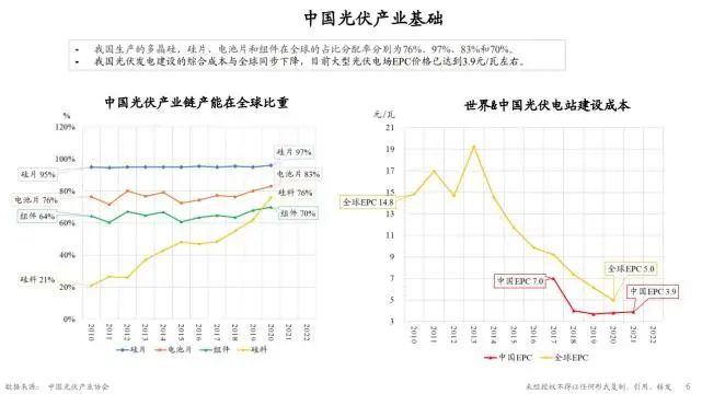 同時(shí)可以看一下中國的光伏產(chǎn)業(yè)基礎(chǔ)。從下面的左圖可以看出來,中國光伏產(chǎn)業(yè)鏈的各個(gè)環(huán)節(jié)在全球占據(jù)了很大的比重,包括硅料的生產(chǎn)也是在迅速提升。看右邊這張圖,中國光伏電站建設(shè)成本也是系統(tǒng)性下降,同時(shí)顯著低于全球的成本水平。