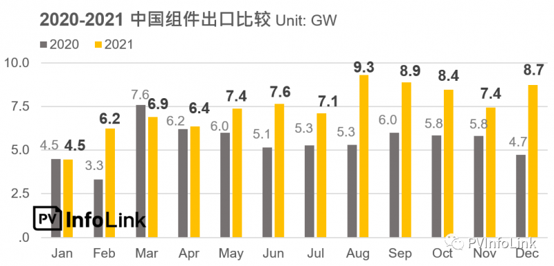 下半年進入了傳統(tǒng)的市場旺季,但是受到產(chǎn)業(yè)上游的瓶頸,造成整體供應(yīng)鏈價格上升,以及中國的能耗政策影響,進一步推升了組件的價格,高昂的海運價格也增加了廠家的負擔,終端在獲利考慮下需求暫緩,采取了包括延后發(fā)貨與重新議價等措施,導(dǎo)致了傳統(tǒng)旺季的下半年,中國組件出口卻呈現(xiàn)了下降的趨勢。