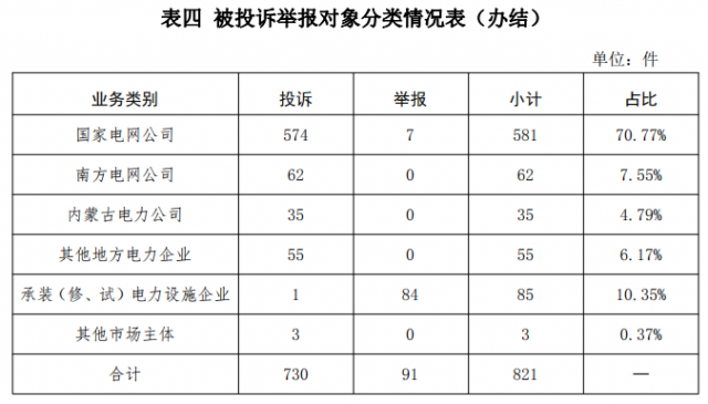 從被投訴舉報對象看,供電企業(yè)733件、占投訴舉報總數(shù)的89.28%,其中國家電網(wǎng)公司581件、占比70.77%,南方電網(wǎng)公司62件、占比7.55%,內(nèi)蒙古電力公司35件、占比3.65%,其他地方電力企業(yè)55件、占比6.17%;承裝(修、試)電力設施企業(yè)85件、占比10.35%;其他市場主體3件、占比0.37%。