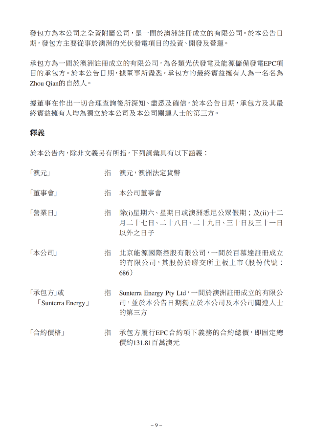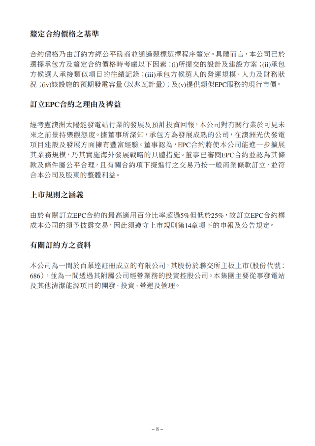 北京能源國際在公告中表示,經(jīng)考慮澳洲太陽能發(fā)電站行業(yè)的發(fā)展及預(yù)計(jì)投資回報,公司對有關(guān)行業(yè)于可見未來的前景持樂觀態(tài)度。據(jù)董事所深知,承包方為發(fā)展成熟的公司,在澳洲光伏發(fā)電項(xiàng)目建設(shè)及發(fā)展方面擁有豐富經(jīng)驗(yàn)。董事認(rèn)為,EPC合約將使公司能進(jìn)一步擴(kuò)展其業(yè)務(wù)規(guī)模,乃其實(shí)施海外發(fā)展戰(zhàn)略的具體措施。董事已審閱EPC合約并認(rèn)為其條款及條件屬公平合理,且有關(guān)合約項(xiàng)下擬進(jìn)行的交易乃按一般商業(yè)條款訂立,并符合公司及股東的整體利益。