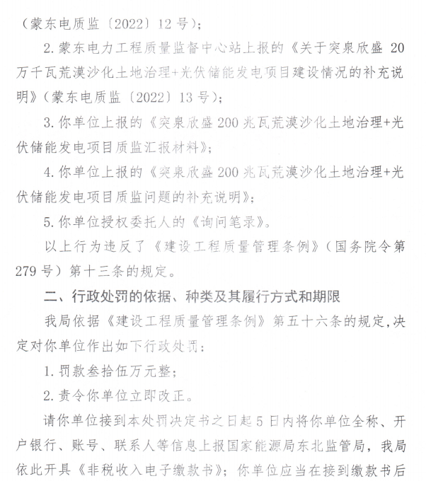 日前,東北能源監(jiān)管局向突泉欣盛太陽能發(fā)電有限公司開出一張罰單,經(jīng)調(diào)查核實,你單位投資建設(shè)的突泉欣盛200兆瓦荒漠沙化土地治理+光伏儲能發(fā)電項目未按照國家有關(guān)規(guī)定辦理工程質(zhì)量監(jiān)督手續(xù)。